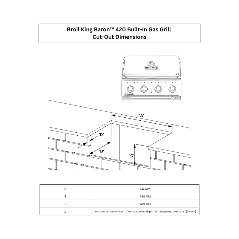 The Broil King Baron™ 420 Built-In is designed for outdoor kitchens that need reliable performance in a space-efficient design. Featuring four stainless steel Dual-Tube™ burners, cast iron cooking grids, and a Flav-R-Wave™ cooking system, this grill delivers even heat distribution and excellent grilling results.
